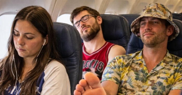 Hän pomppasi ylös, veti jalkansa nopeasti pois ja alkoi huutaa koko lentokoneessa: